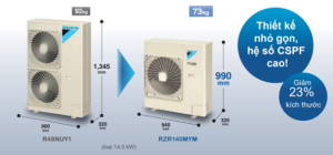 Dàn nóng máy lạnh âm trần 2.5 HP Daikin FCQ60KAVEA có thiết kế nhỏ gọn với kích thước với chiều cao chỉ có 990mm, dễ dàng lắp đặt ở ban công, sân thượng hoặc không gian hẹp, và hiệu suất tiết kiệm năng lượng CSPF vẫn cao.